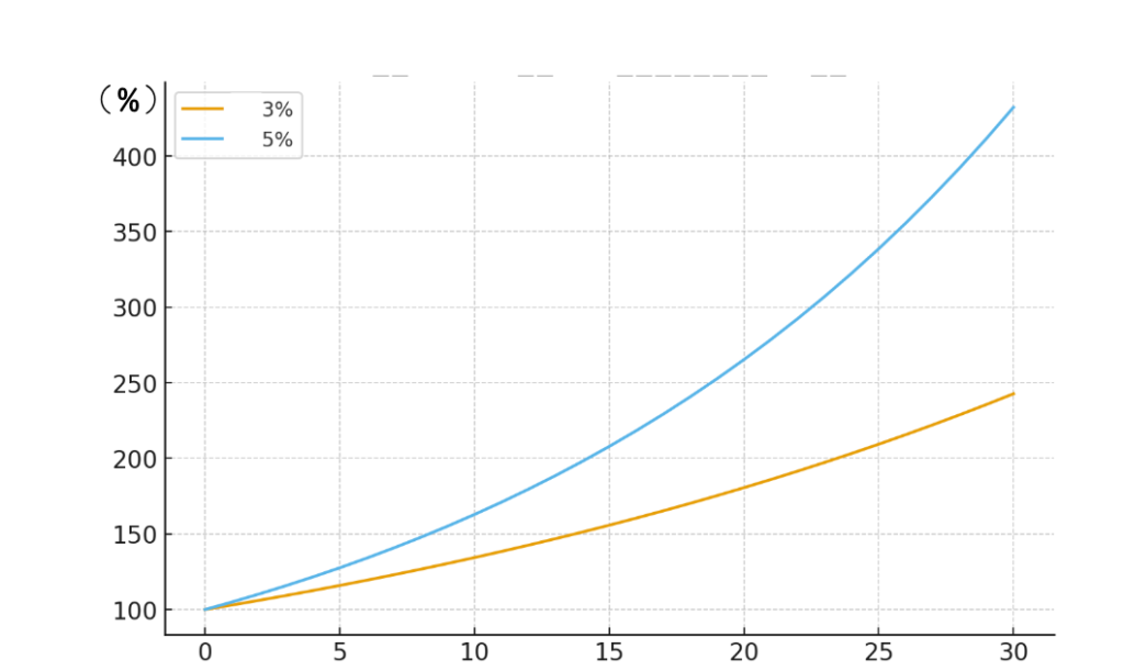 3%の成長と5%の成長、たった2%の成長ですが、30年も経つと下記グラフのように大きな差が生まれてしまいます。