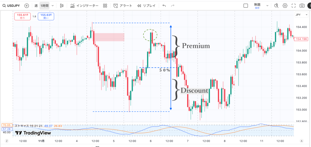 これは非常に簡単な考え方で、1つのスイング(上昇波、下降波)で、半分より高い時は売り仕掛け(Premium)、半分より低い時は買い仕掛け(Discount)をしましょうというものです。