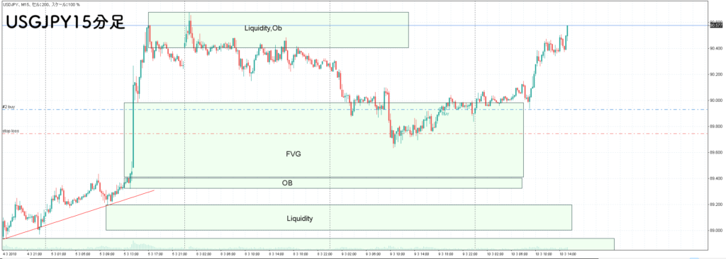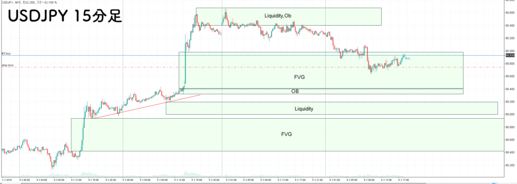 小さな上昇チャネル後のFVG内で15分足レベルで反転の兆しが見えたのでロング。