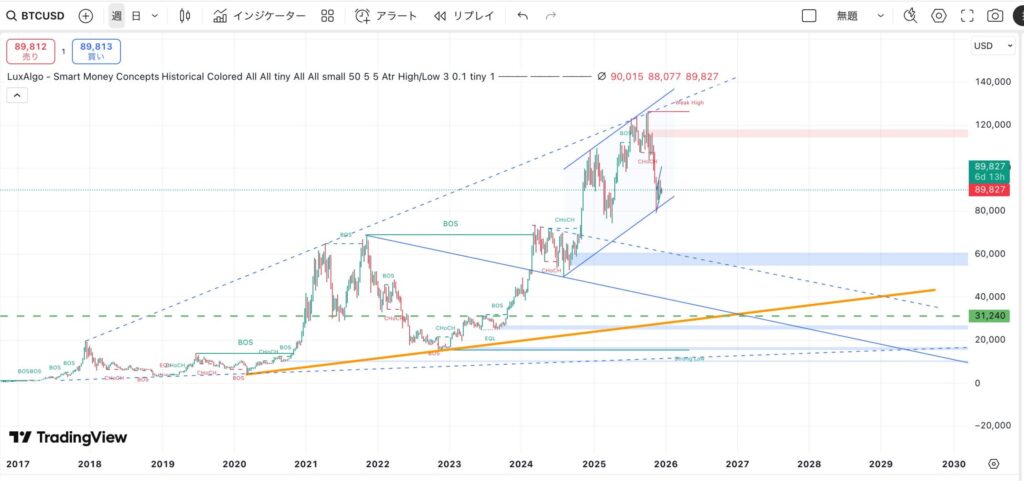 そんな状態にある中で、2017年の最高値から始まる上値抵抗線に価格が接近した時点で「ビットコインはもう終わりだよ」というのは難しいことではありません。