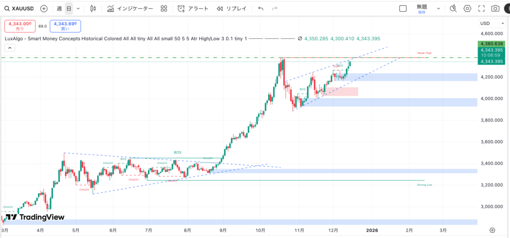 2025年、GOLDはおよそ2600ドルから、執筆時点でおよそ4300ドルと、約65%の高騰を見せました。紛れもなく、今年上位のパフォーマンスをもたらした銘柄でしょう。