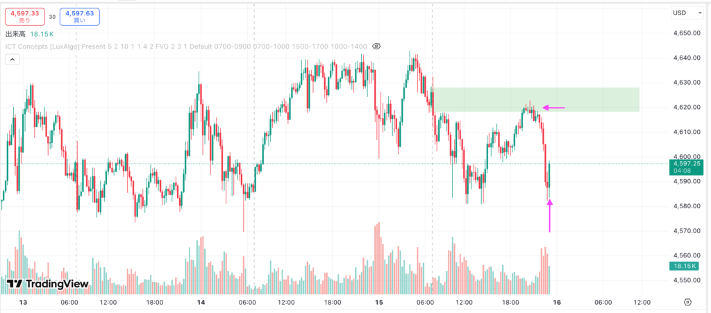 結果、15分足のオーダーブロック(緑ゾーン)を根拠に売ってみました。