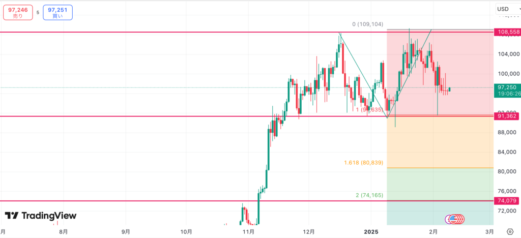 ぱっと見でダブルトップを形成しており、かつ2024年高値圏へのリテストをしておらず、ダブルトップの目標価格はこの高値圏74,000ドル前後と一致しています。