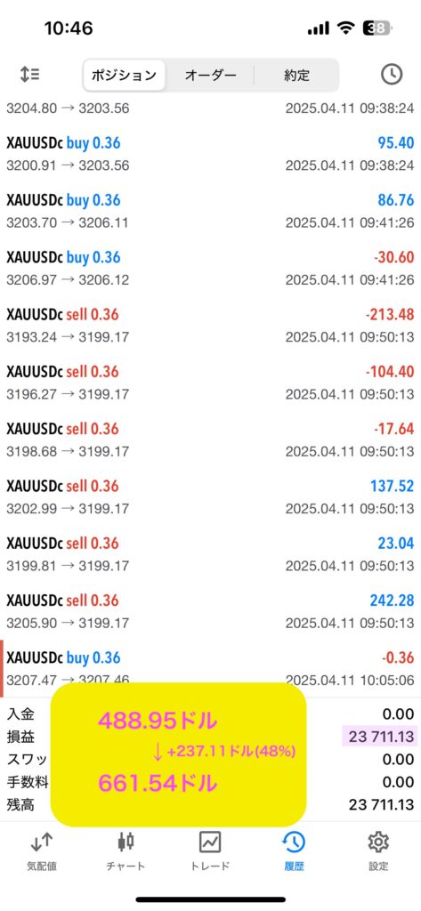 デフォルトのパラメータから「基準原資」だけ2000に変更、2枚のチャートにそれぞれ買いのみ、売りのみを設定してみたところ、4/7〜4/11の5日間でなんと48%という驚異的なパフォーマンスを得られました。