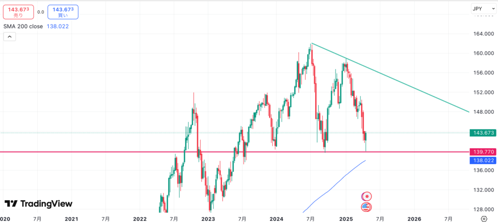 急落に注意したいものの、大きなディセンディングが描けることから、しばらくは140円台前半で安定する感じでしょうか。