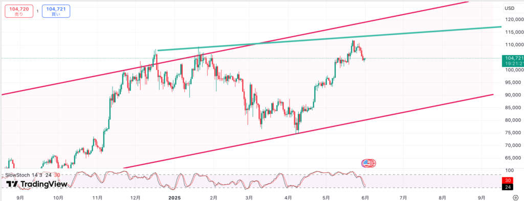 BTCもやはり上値が重いですね。日足は上昇余地があるので上値は追いかけそうですが、長期的には週足の上値余地がないので、微妙な形です。