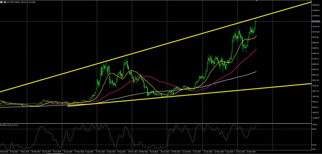 BTCは最高値を更新しましたが、逆ペナント上限で抑えられた形となりました。