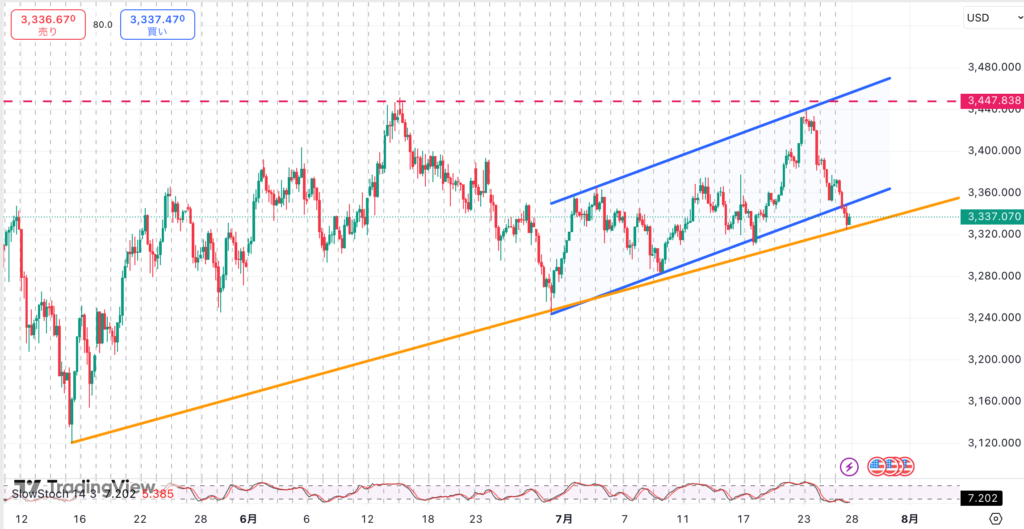 GOLDは7月頭からの上昇並行チャネルを割り込む動きをしており、回帰できるかに注目したい局面です。