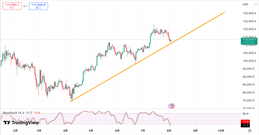 ビットコインは日足の安値を結ぶトレンドライン、日足75日移動平均線を下抜ける動きをするかに注目です。